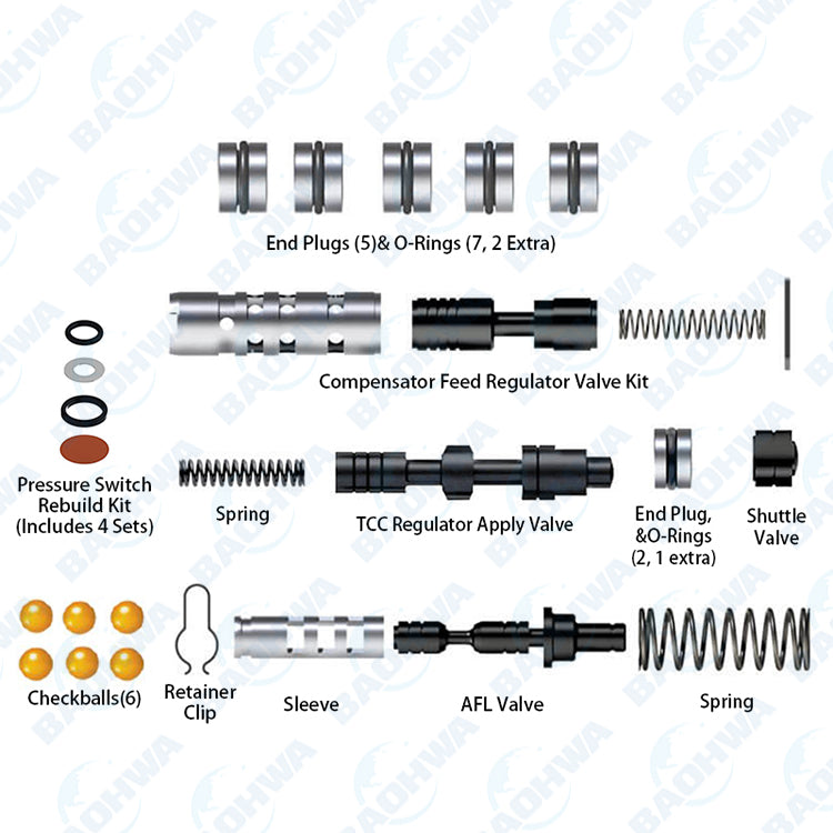 | Kit Contains | Pressure Switch Rebuild Kit Rivets (2) 1 Extra Compensator Feed Regulator Valve Kit TCC Regulator Apply Valve, Shuttle Valve, End Plug, Spring & O-rings 2 O-Rings, 1 Extra AFL Valve, Sleeve, Spring & Retainer End Plugs (5) O-Rings (7) 2 Extra Checkballs (6) .250" Dia. Drill Bit .062" Dia. Aluminum Plugs (2) .062" Dia., 1 Extra |