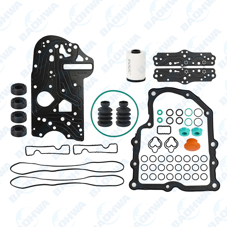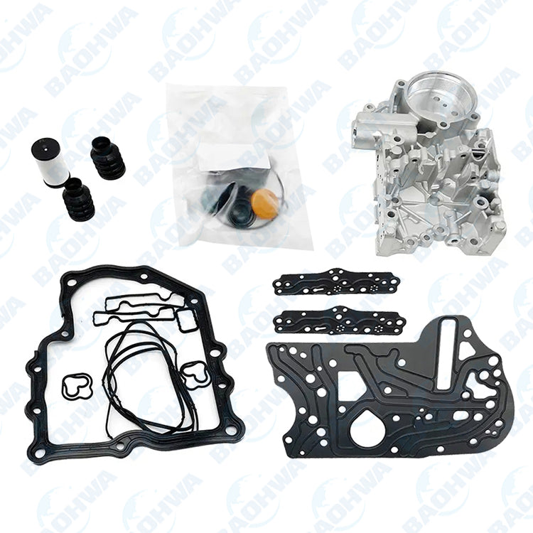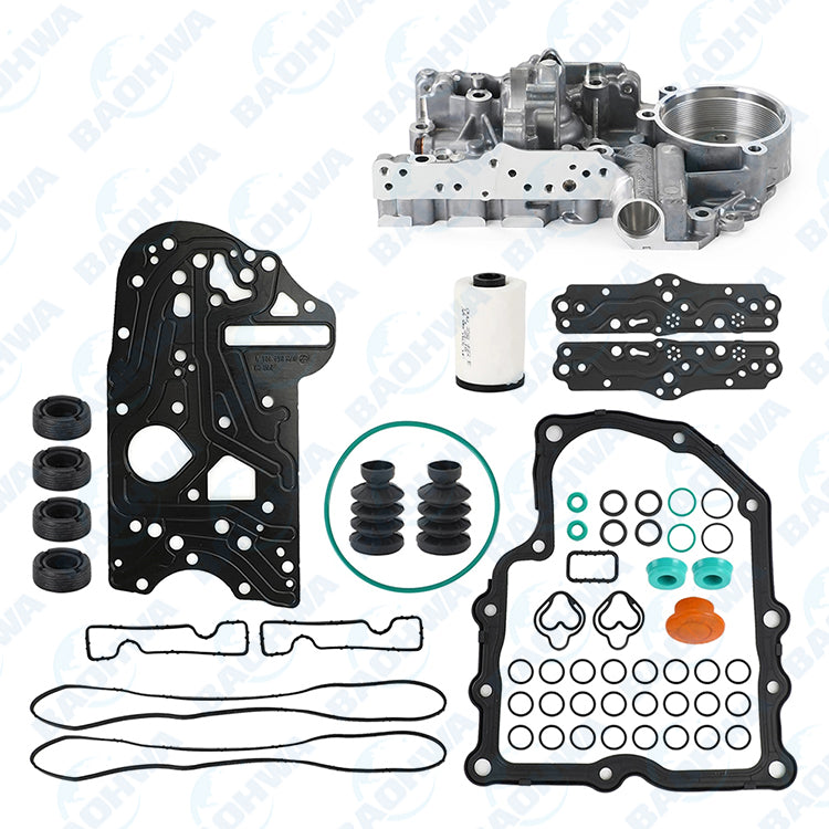 | Package Include | 1x O-ring for hydraulic pressure sensor 1x Sub Kit with seals for clutch actuators 1x Sub Kit with bellows, seals and o-rings for the gear selectors 1x Sub Kit with rubber gaskets for the electric plate 1x Sub Kit with seal washers, aluminium and copper 1x Sub Kit with hydraulic pump seals 1x Sub Kit with solenoid o-rings 1x Cover gasket 1x Gasket as separator plate 2x Gaskets at solenoid connectors 1x Outer o-ring on pressure accumulator 1x Oil filter 1x Valve body Accumulator Redisgned With 3.6MM Port To Prevent Breakage (Basically Every seal in the Mechatronic is in this kit) |